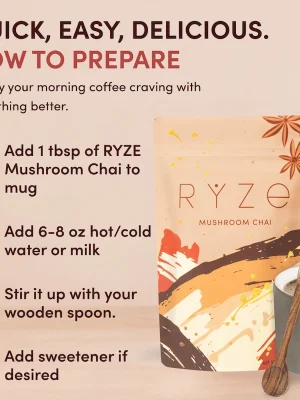 Savor the flavor of delicious chai while also giving your body and mind a boost. RYZE Chai is packed with 6 adaptogenic mushrooms and warming Ayurvedic spices to deliver balanced energy, better focus, and immune support.