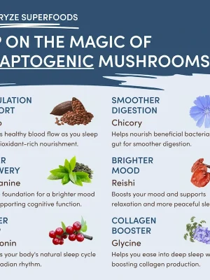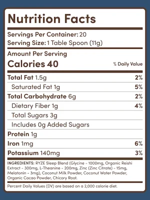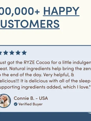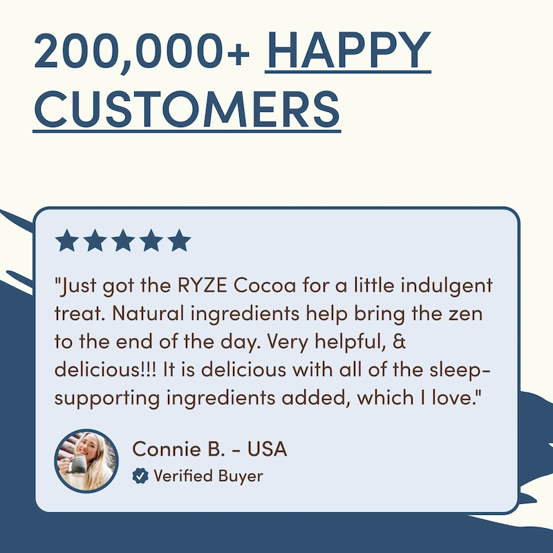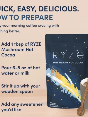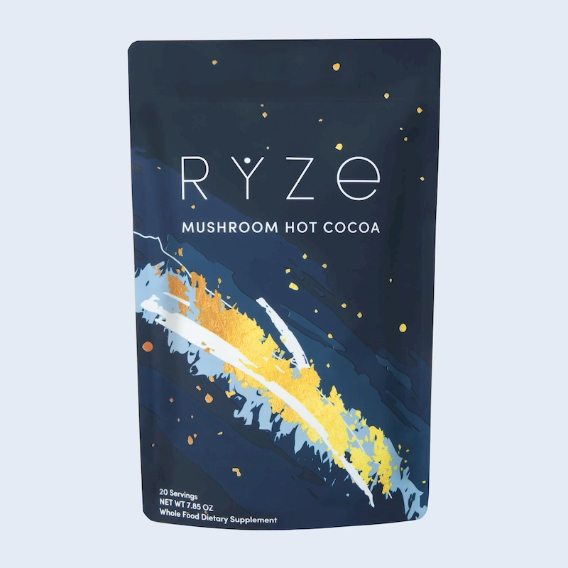 RYZE Mushroom Hot Cocoa, a nighttime treat that marries the magical calming powers of reishi with the snooze-inducing benefits of L-theanine, glycine and melatonin for a blend that helps you unwind at night and wake up refreshed in the morning. Blended with cacao powder for powerful antioxidants and coconut water for hydration, you’ll start a better day the night before.