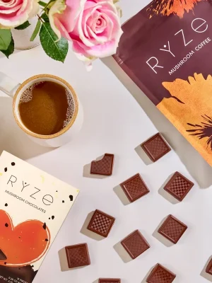 Our best-selling mushroom coffee with your daily chocolate pick me up. Feeling adventurous? Melt RYZE Mushroom Chocolates in your cup of coffee for a sweet boost.